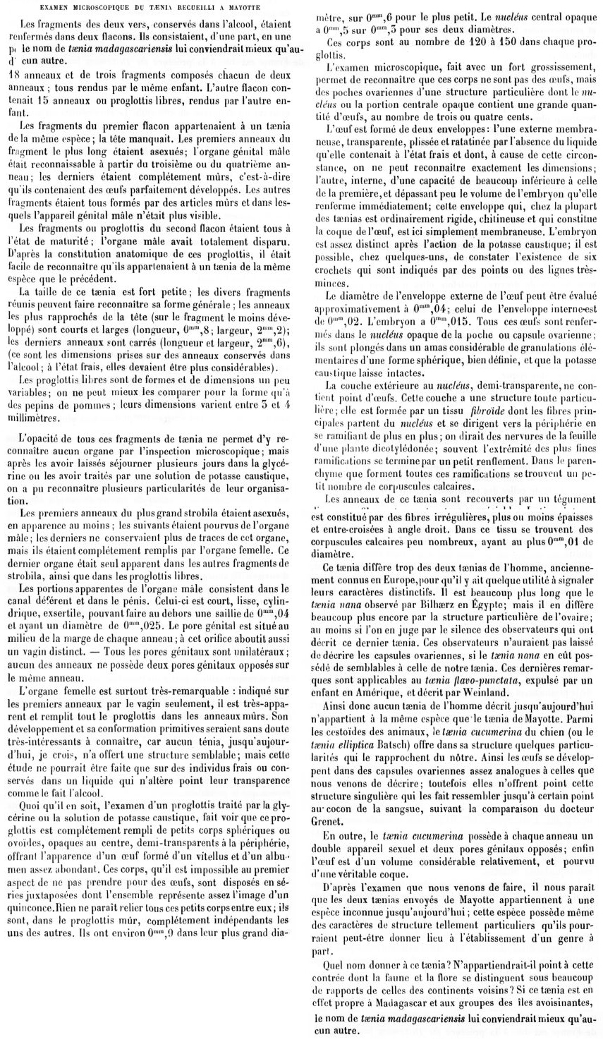 Davaine, C. J. 1870. Examen microscopique du Taenia recueilli a Mayotte. Comptes Rendus des Séances et Mémoires de la Société de Biologie 21: 236-240. (5207) |