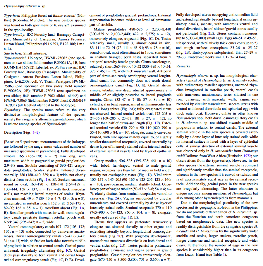 Fig. 1. Hymenolepis alterna n. sp. A, Holotype (HWML-75062), dorsoventral view of scolex; B, Paratype (HWML-75063, P.2902#2B), dorsoventral view of scolex; C, Holotype, male mature proglottides; D, Ho... MoreFig. 1. Hymenolepis alterna n. sp. A, Holotype (HWML-75062), dorsoventral view of scolex; B, Paratype (HWML-75063, P.2902#2B), dorsoventral view of scolex; C, Holotype, male mature proglottides; D, Holotype, hermaphroditic mature proglottides; e, Holotype, genital ducts, dorsal view. Scale-bars: A, B, E, 200µm; C, D, 500µm |