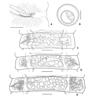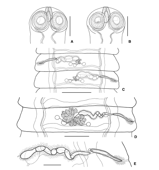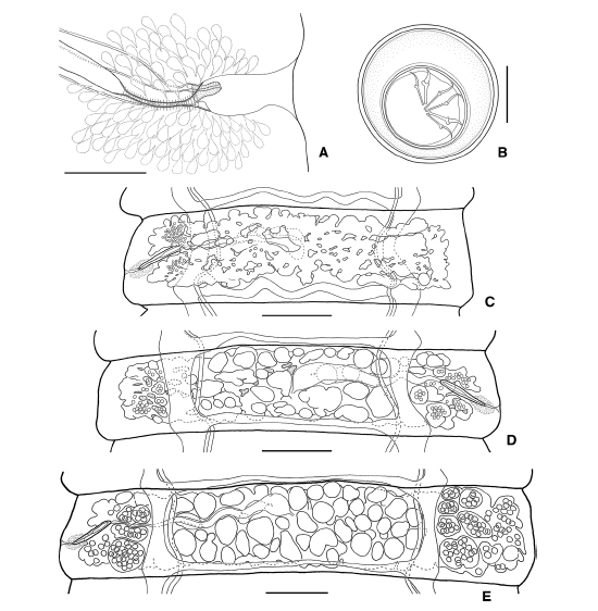 (HWML-75063, P.2902#2B), gravid proglottis from ventral side, showing saccate uterus with ventral uterine diverticula. Scale-bars: A, 50µm; B, 20µm; C–E, 500µm |