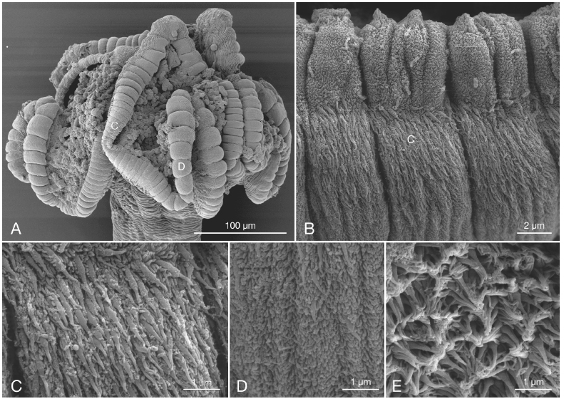 Figure 3. Scanning electron micrographs of Anthocephalum decrisantisorum n. sp. and Anthocephalum healyae n. sp. A. A. decrisantisorum n. sp., scolex. Letters indicate locations of Figures 3C-D. B. A. decrisantisorum n. sp., marginal loculi. Letter indicates location of Figure 3C. C. A decrisantisorum n. sp., proximal surface of marginal loculus near bothridial rim. D. A. decrisantisorum n. sp., proximal surface of bothridium. E. A. decrisantisorum n. sp., distal surface of bothridium.