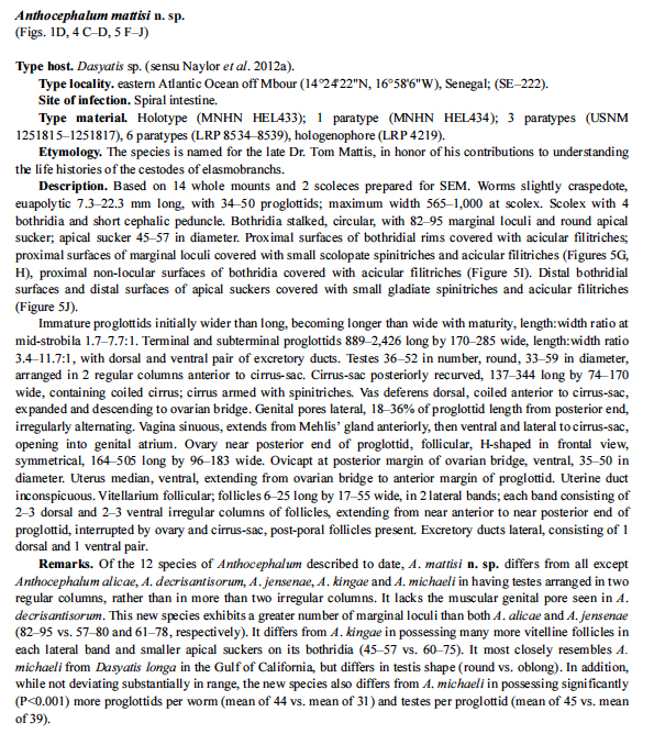 sp., scolex of paratype (LRP 8535). D. A. mattisi n. sp., proglottid of holotype (MNHN HEL433).
