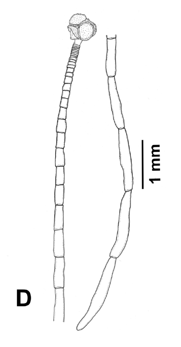 FIGURE 1. Line drawings of Anthocephalum n. spp. D. Anthocephalum mattisi n. sp., holotype (MNHN HEL433).