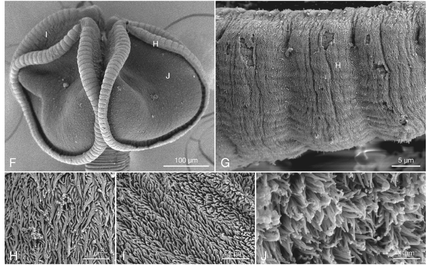 locations of Figures 5H–J. G. A. mattisi n. sp., marginal loculi. Letter indicates location of Figure 5H. H. A. mattisi n. sp.,
