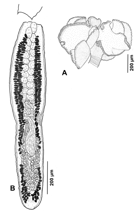 FIGURE 6. Scolex and proglottid line drawings of Anthocephalum meadowsi n. sp. and Anthocephalum odonnellae n. sp.. A. A. meadowsi n. sp., scolex of holotype (QM G234607). B. A. meadowsi n. sp., proglottid of holotype (QM G234607).