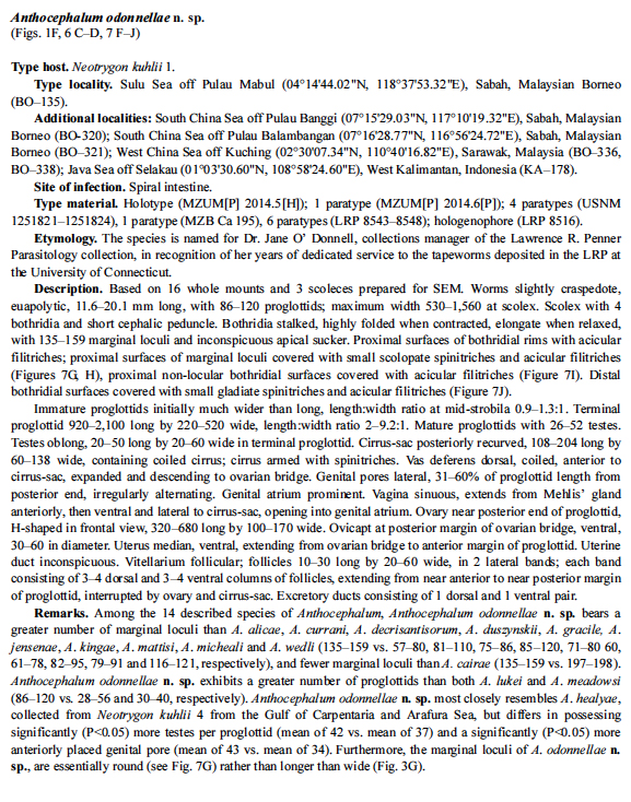 Ruhnke, T. R., J. N. Caira, and A. Cox. 2015. The cestode order Rhinebothriidea no longer family-less: a molecular phylogenetic investigation with erection of two new families and description of eight new species of Anthocephalum. Zootaxa 3904(1): 051-081.