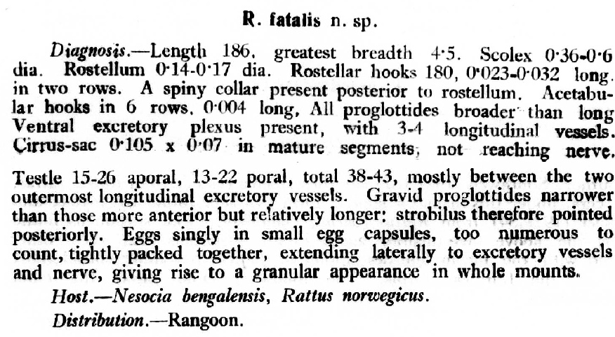 | Host Notes | Two hosts given: Rattus norwegicus [Rattus norvegicus] and Nesocia bengalensis [Bandicota bengalensis] (type host not specified). |