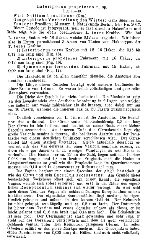 Fuhrmann, O. 1907. Bekannte und neue Arten und Genera von Vögeltaenien. Zentralblatt für Bakteriologie, Parasitenkund und Infektionskrankheiten. I. Abteilung Originale 45: 516–536. (6089) Download PDFFuhrmann, O. 1933. Cestodes nouveaux. Revue Suisse de Zoologie 40: 169-178. (2843) Download PDF |