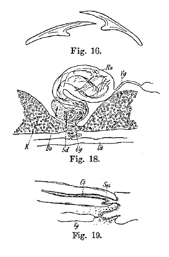 Fig. 16. Haken von Lateriporus propeteres n. sp. Fig. 18. Mediane Partie eines Querschnittes durch Lateriporus propeteres n. sp. K Keimstock, D Dotterstock, Sd Schalendrüse, Ug Uteringang, Ut Uterus, Rs Receptaculum seminis, Vg Vagina. Fig. 19. Ausmundung von Cirrusbeutel und Vagina von Lateriporus propeters. Ci bestachelte Cirrus mit Sacculus accessorius internus Sci, Vg Vagina.