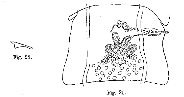 Fig. 28. Haken von Monopylidium passerinum n. sp. Fig. 29. Proglottis von M. passerinum n. sp.