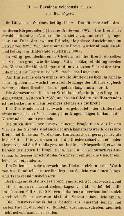 von Janicki, C. 1902. Ueber zwei neue Arten des Genus Davainea aus Celebensischen Säugern. Archives de Parasitologie 6: 257-292. (6471)Lopez-Neyra, C.-R. 1931. Relations du Davainea madagascariensis et de especes des mammiferes. Considerations sur les Davainea. Annales de Parasitologie Humaine et Comparee 9: 162-184. (7471) |