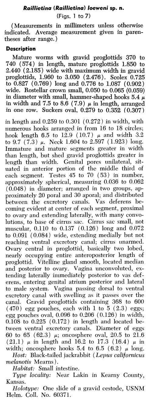 Bartel, M. H. and M. F. Hansen. 1964. Raillietina (Raillietina) loeweni sp. n. (Cestoda: Davaineidae) from the hare in Kansas, with notes on Raillietina of North American mammals. Journal of Parasitology 50: 448-453. (7469) |