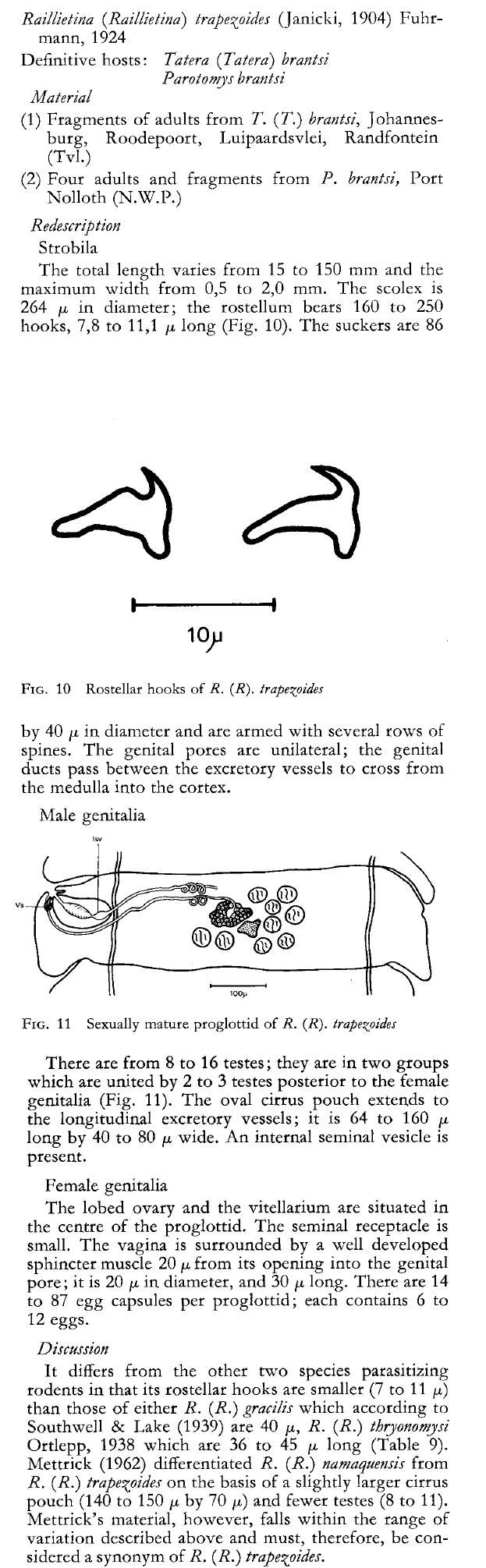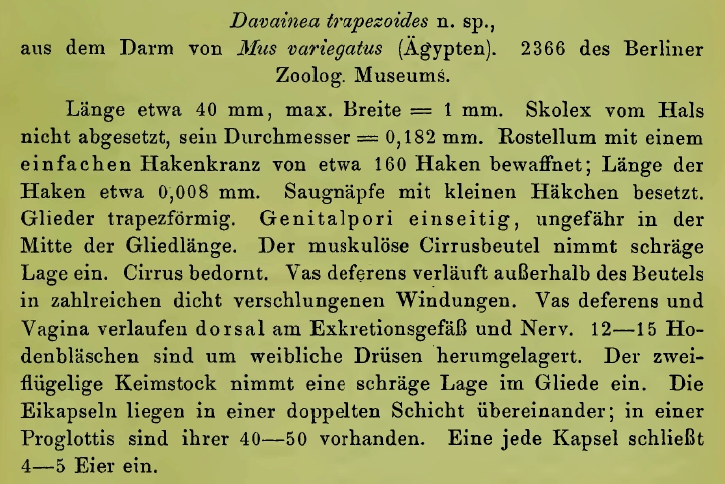 | Synonyms | Davainea trapezoides Janicki, 1906; Raillietina (Ransomia) trapezoides (Janicki, 1906) Fuhrmann, 1920; Raillietina kordofanensis Meggitt & Subramanian, 1927; Kotlania trapenzoides (Janicki, 1906) Lopez-Neyra, 1931 |