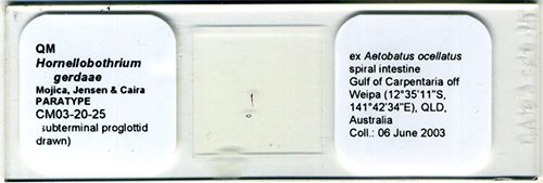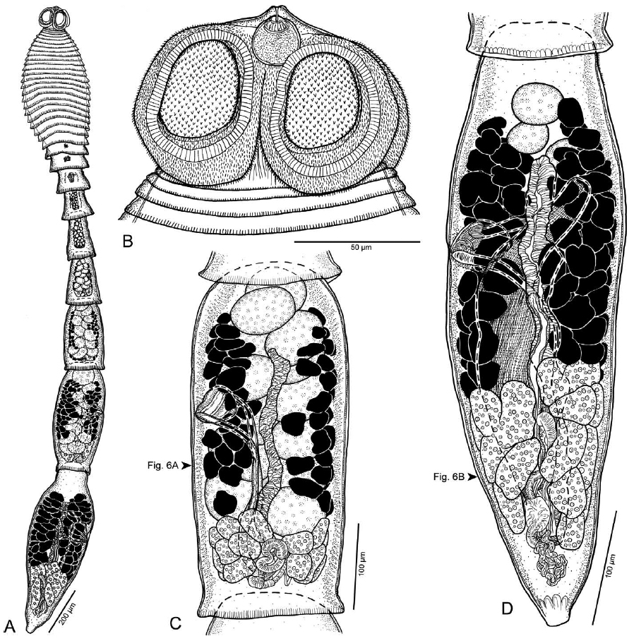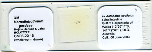 | Type Material | holotype (QM G234349) and 8 paratypes (7 whole mounts and 1 cross sections series and its whole-mounted voucher; QM G234350–234357); 5 paratypes (whole mounts; USNPC 10798); 5 paratypes (whole mounts; LRP 8431–8435); 2 scoleces (with 1 wholemounted voucher) and 2 whole worms prepared for SEM retained in the personal collection of K.J. at the University of Kansas |