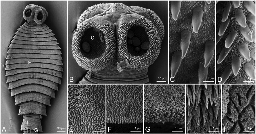 Anterior proglottid with small gladiate spinitriches. (I) Proglottid surface with capilliform filitriches.
