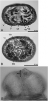 cirrus sac. (B) Cross section of mature proglottid of H. gerdaae n. sp. at level of ovarian bridge. (G) Scolex of H. gerdaae n. sp. showing size of apical organ. Abbreviations: AO, apical organ; O, ovary; OC, ovicapt; T, testis; UT, uterus; V, vitelline follicle; VA, vagina; VD, vas deferens.
