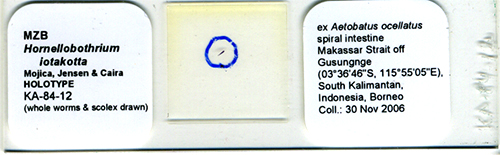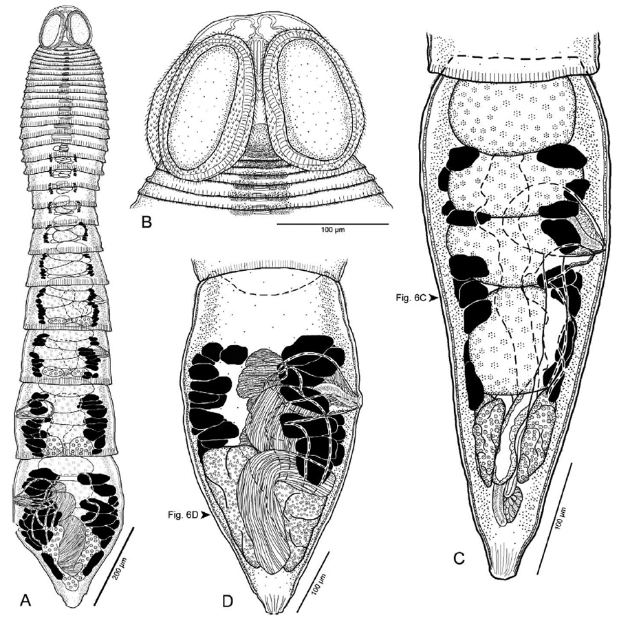 | Type Material | holotype (MZB Ca185) and 3 paratypes (whole mounts; MZB Ca186–188); 7 paratypes (6 whole mounts and 1 cross sections series and its whole-mounted voucher; USNPC 107949); 6 paratypes (whole mounts; LRP 8439–8444); 2 scoleces prepared for SEM (with their whole-mounted vouchers) retained in the personal collection of K.J. at the University of Kansas |