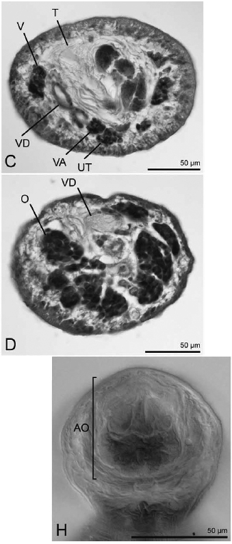 Abbreviations: AO, apical organ; O, ovary; OC, ovicapt; T, testis; UT, uterus; V, vitelline follicle; VA, vagina; VD, vas deferens.