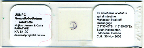 | Total Number of Type Specimens | based on 19 specimens: 16 whole mounts of mature worms, 1 cross section series of 2 mature proglottids, and 2 scoleces with hood prepared for SEM |