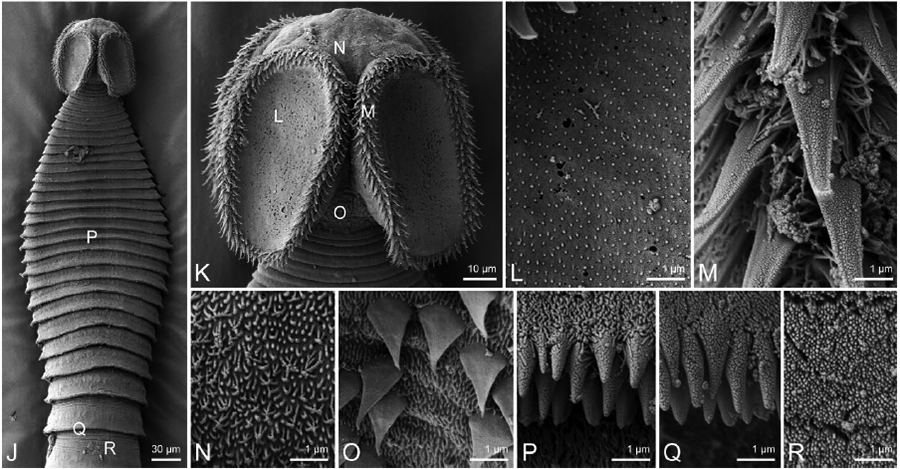 P–R. (K) Scolex; small letters indicate location of details shown in L–O. (L) Distal bothridial surface with papilliform to acicular filitriches. (M)