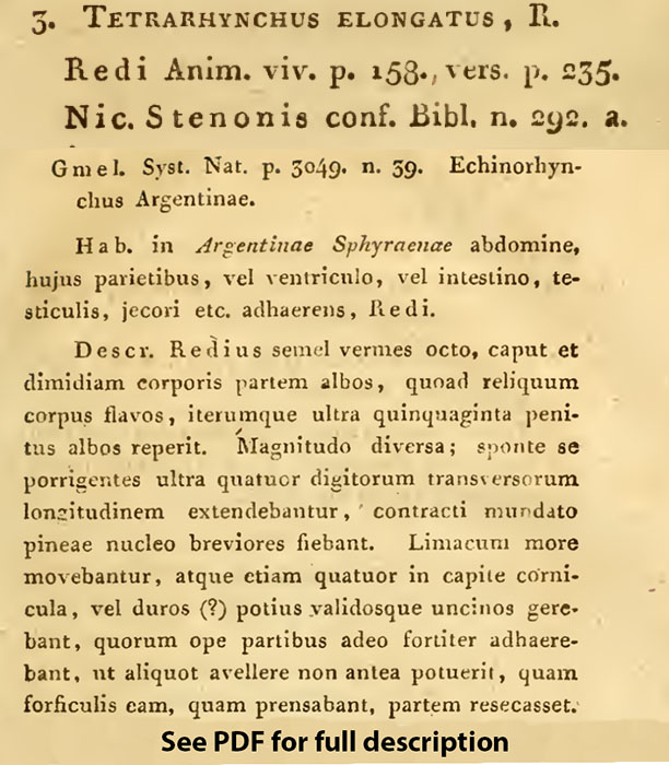| Scientific Name Notes | This record was apparently overlooked by Dollfus (1942) who attributed it to "(Rudolphi. 1819)" aassuming it was indentical with Anthocephalus elongatus Rudolphi, 1819, now a synonym of Gymnorhynchus horridus Goodsir, 1841 |
