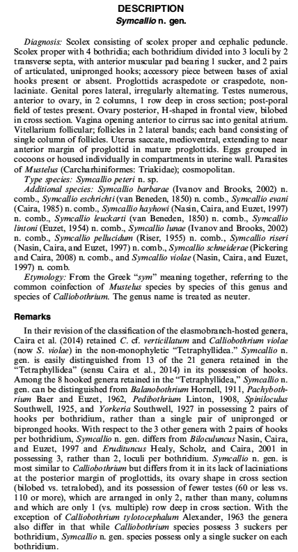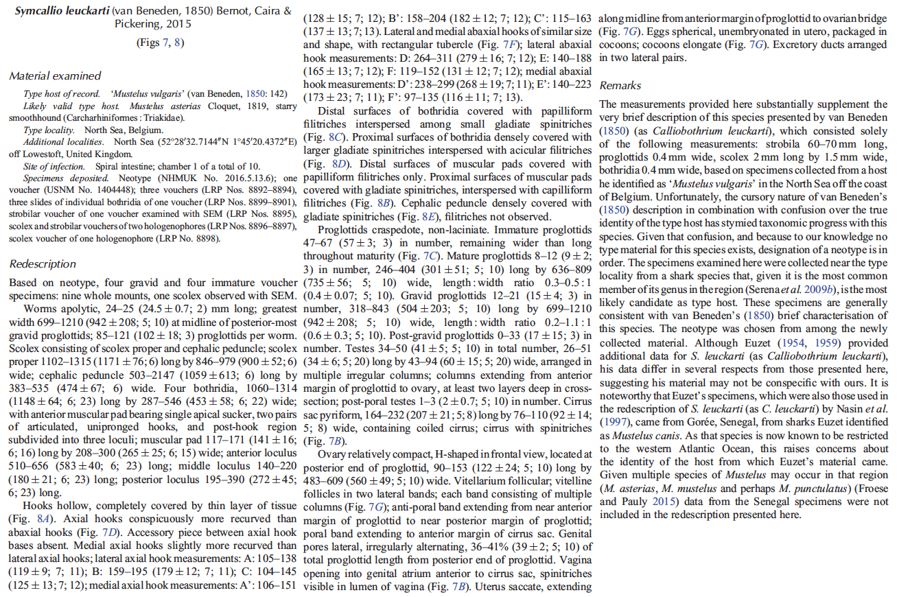 van Beneden, P.-J. 1850. Recherches sur la faune littorale de Belgique. Les vers cestoides, considérés sous le rapport physiologique, embryogénique et zooclassique. Mémoires de l‘Academie Royale des Sciences, des Lettres et des Beaux-Arts de Belgique 25: 1-199 (+plates). (472) Download PDFBernot, J. P., J. N. Caira, and M. Pickering. 2015. The dismantling of Calliobothrium (Cestoda: Tetraphyllidea) with erection of Symcallio n. gen. and description of two new species. Journal of Parasitology 101(2): 167–181. (6504) Download PDF |