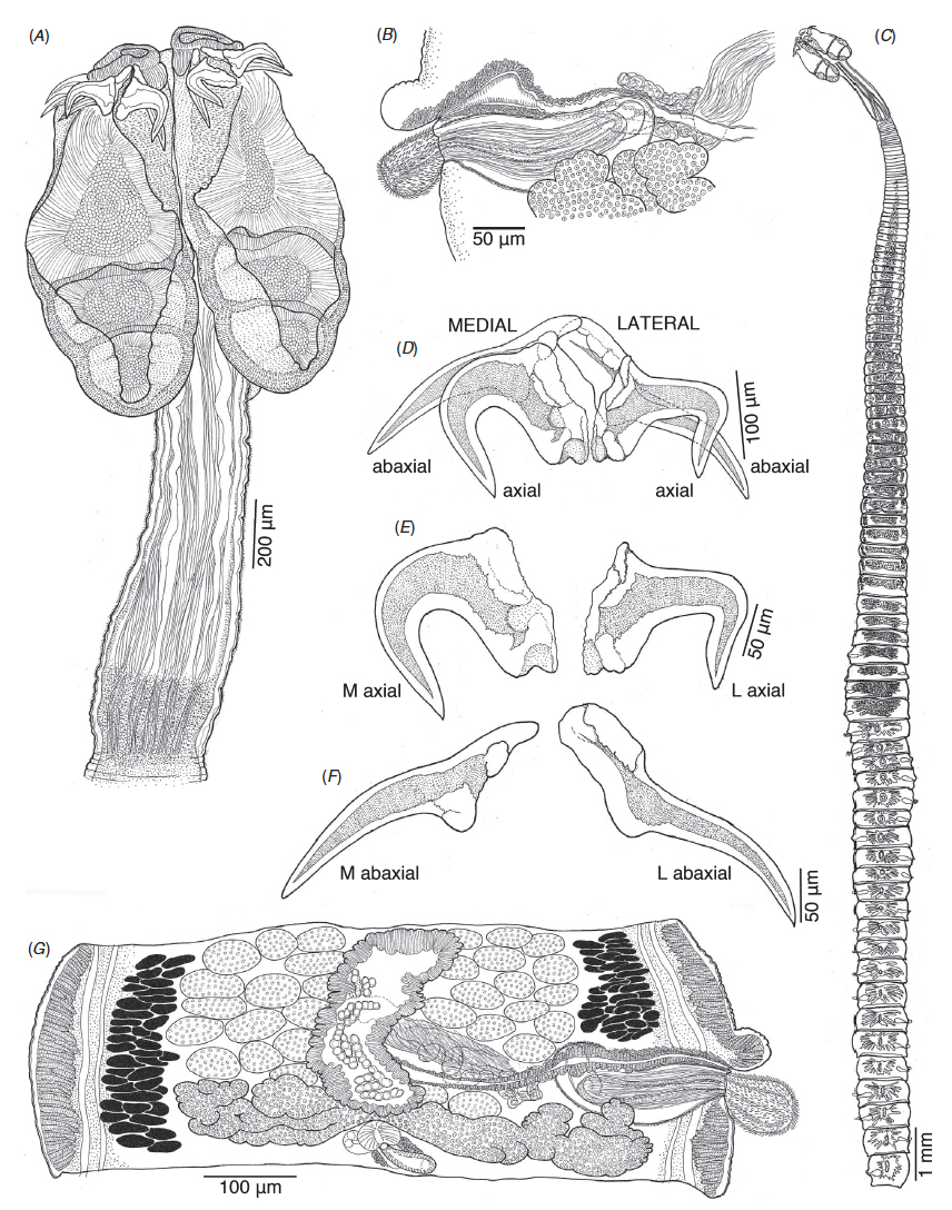 | Voucher Material | one voucher (USNM No. 1404448); three vouchers (LRP Nos. 8892–8894), three slides of individual bothridia of one voucher (LRP Nos. 8899–8901), strobilar voucher of one voucher examined with SEM (LRP Nos. 8895), scolex and strobilar vouchers of two holo |