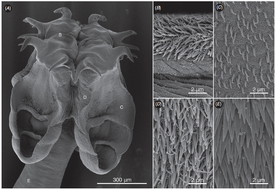 From Bernot et al, 2016 (Cit #6983); Fig. 8. Scanning electron micrographs of Symcallio leuckarti. (A) Scolex; letters indicate location of details in micrographs B–E; (B) microtriches on distal and proximal surfaces of muscular pad; (C) microtriches on distal surface of anterior loculus; (D) microtriches on proximal surface of bothridium; (E) microtriches on cephalic peduncle.