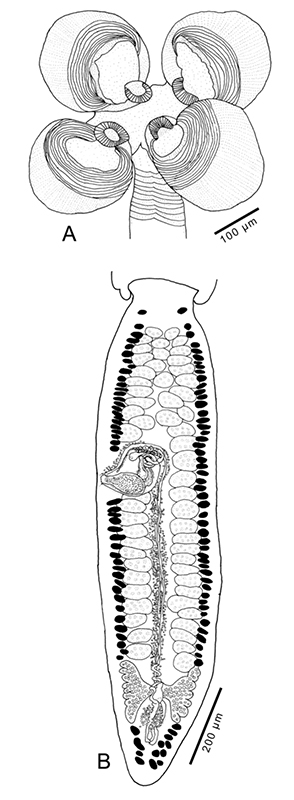 From Ruhnke, 2011 (Cit# 5498). Fig. 139. Line drawings of Paraorygmatobothrium paulum (Linton, 1897) n. comb. A. Scolex of voucher (LRP 7433). B. Terminal proglottid of voucher (LRP 7434).