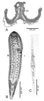 From Ruhnke, 2011 (Cit# 5498). Fig. 138. Photomicrographs of Paraorygmatobothrium paulum (Linton, 1897) n. comb. A. Frontal section of voucher (LRP 7431). B. Free proglottid of voucher (LRP 7432). C. Egg.