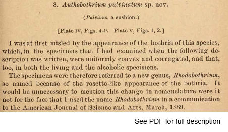 | Scientific Name Notes | Linton first used this name in 1889 (Citation 267) in a communication about his 1890 publication (Citation No. 1011), but provided no description of the type species, R. pulvinatum or the genus at that time and thus the 1889 record is considered to be a Nomen nudum. In 1890 Linton noted that he felt he had been "misled" (pg. 759) by the morphology and placed his new species in Anthobothrium as A. pulvinatum. However, in 1890 he also noted that he believed he was in error in establishing a new genus for A. pulvinatum, which he described in detail in the 1890 publication. However, as a consequence Linton (1890) also formally established both Rhodobothrium and its type species R. pulvinatum. Determined to be a genus of the Rhinebothriidea by Healy et al (2009) and Ruhnke (2011). |