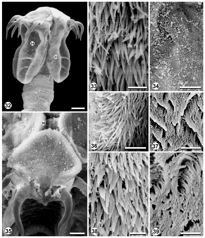 FIGURES 32–39. Calliobothrium barbarae n. sp., scanning electron micrographs. 32. Scolex. Bar = 50 um. 33. Microtriches on proximal
