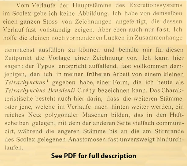 Crety, C. 1890. Contribuzione all'anatomica del sistema muscolare e nervoso del Dibothriorhynchus benedeni Crety (Tetrarhynchus tenuis van Bened.). Nota preliminare.. Bulletin della Societa di naturalisti in Napoli, ser. 1 4(1): 39-44. (6547) Download PDFPintner, T. 1893. Studien an Tetrarhynchen nebst Beobacktungen an anderen Bandwürmern (I. Mittheilung). Sitzungsberichte. Abt. 1, Mineralogie, Krystallographie, Botanik, Physiologie der Pflanzen, Zoologie, Paläontologie, Geologie, physische Geogrphie und Reisen. Kaiserliche Akademie der Wissenschaften in Wien, Mathematisch-Naturwissenschaftliche Klasse 102: 605-650. (4706) Download PDF |