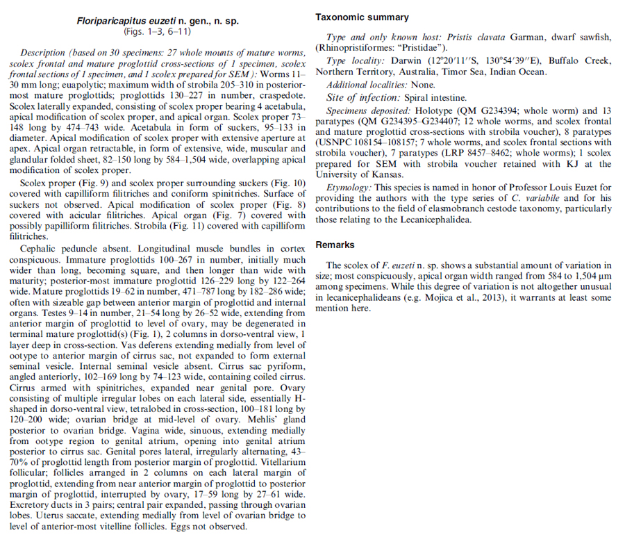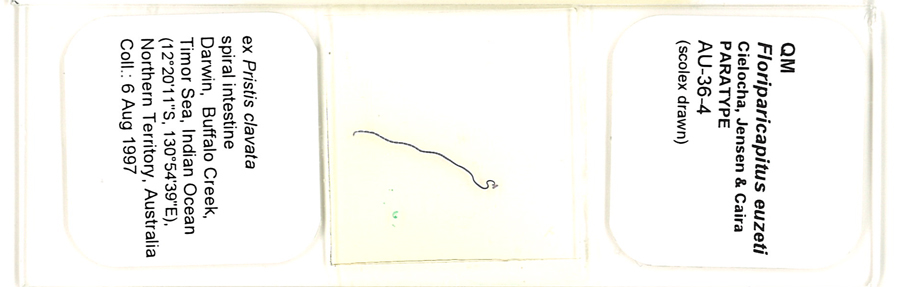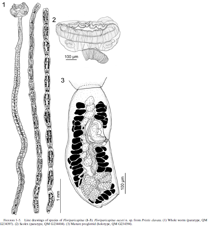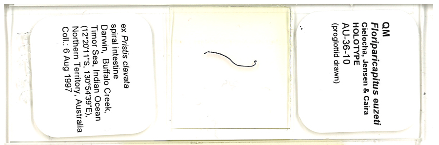 | Type Material | Holotype (QM G234394; whole worm) and 13 paratypes (QM G234395–G234407; 12 whole worms, and scolex frontal and mature proglottid cross-sections with strobila voucher), 8 paratypes (USNPC 108154–108157; 7 whole worms, and scolex frontal sections with strobila voucher), 7 paratypes (LRP 8457–8462; whole worms); 1 scolex prepared for SEM with strobila voucher retained with KJ at the University of Kansas. |
