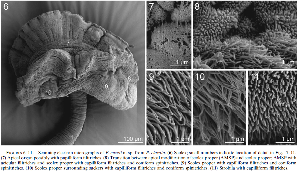 spinitriches. (10) Scolex proper surrounding suckers with capilliform filitriches and coniform spinitriches. (11) Strobila with capilliform filitriches.