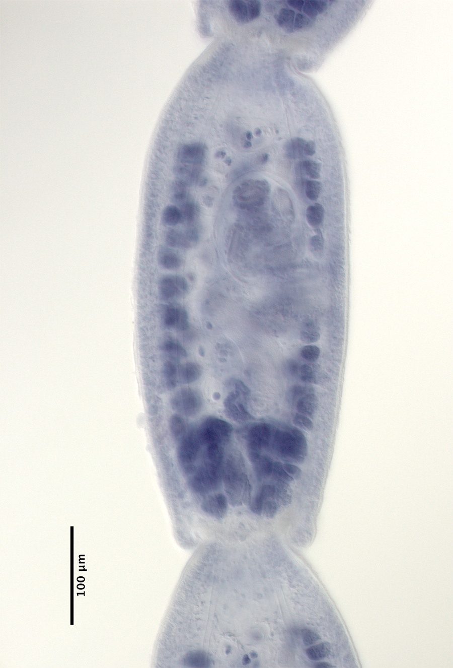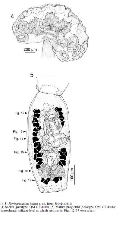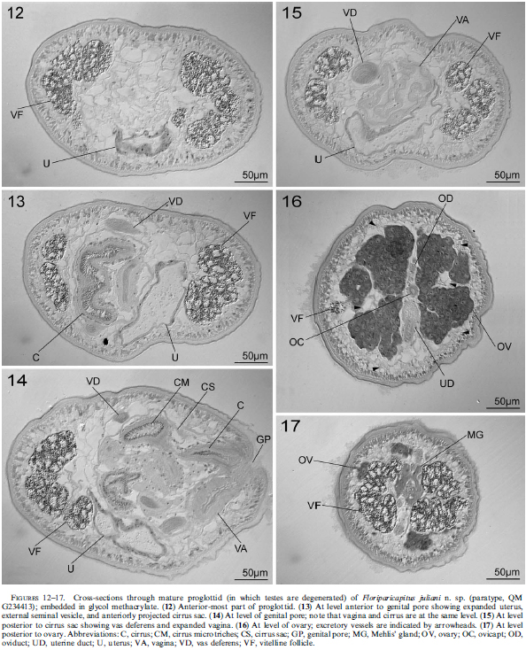 | Type Material | Holotype (QM G234408; whole worm) and 5 paratypes (QM G234409–G234413; 4 whole worms, and scolex frontal and mature proglottid cross-sections with strobila voucher); 4 paratypes (USNPC 108158; 3 whole worms, and scolex frontal and immature and mature proglottid cross-sections with strobila voucher); 3 paratypes (LRP 8475–8477; whole worms); 1 scolex prepared for SEM with strobila voucher retained with KJ at the University of Kansas. |