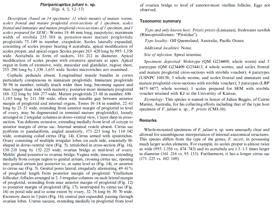 Cielocha, J. J., K. Jensen, and J. N. Caira. 2014. Floriparicapitus, a new genus of lecanicephalidean tapeworm (Cestoda) from sawfishes (Pristidae) and guitarfishes (Rhinobatidae) in the Indo-West Pacific. Journal of Parasitology 100(4): 485–499. (6419) Download PDF |