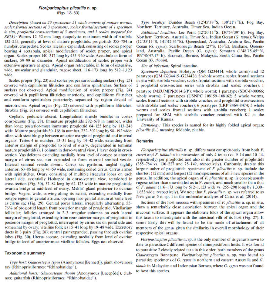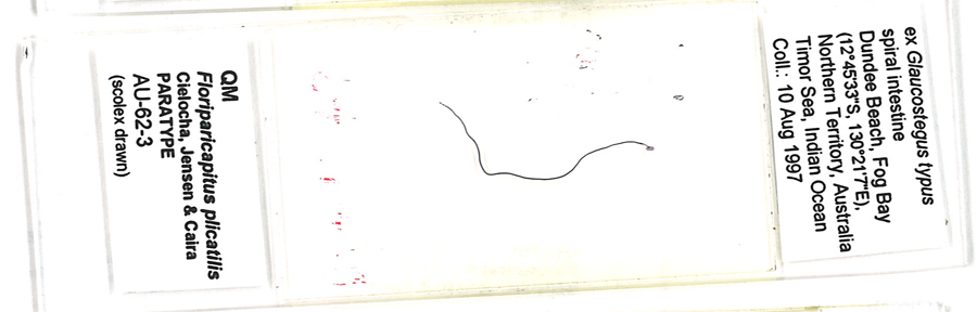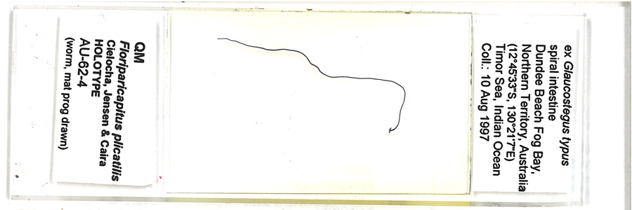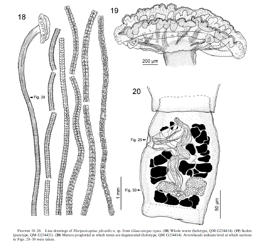 (paratype, QM G234421). (20) Mature proglottid in which... MoreFIGURES 1820. Line drawings of Floriparicapitus plicatilis n. sp. from Glaucostegus typus. (18) Whole worm (holotype, QM G234414). (19) Scolex