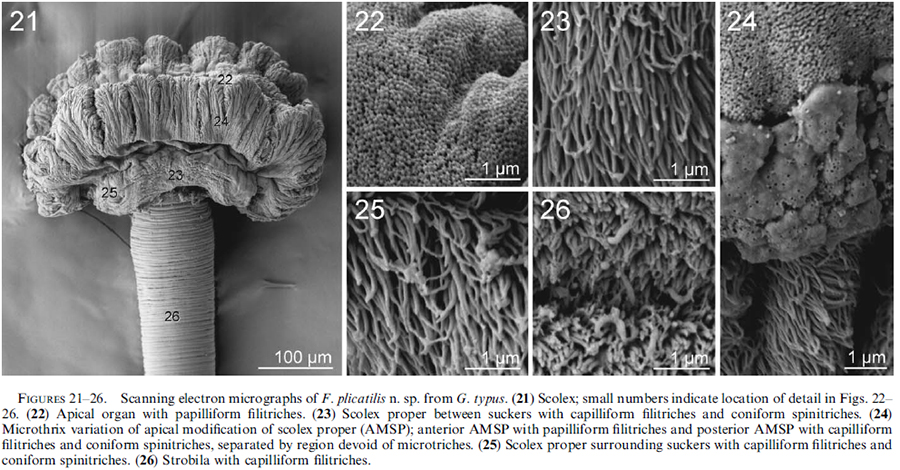 filitriches and coniform spinitriches, separated by region devoid of microtriches. (25) Scolex proper surrounding suckers with capilliform filitriches and coniform spinitriches. (26) Strobila with capilliform filitriches. |