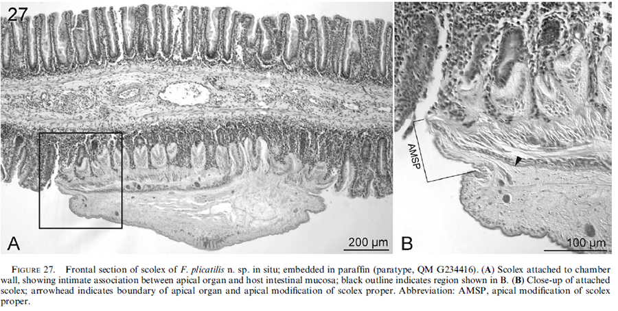 wall, showing intimate association between apical org... MoreFIGURE 27. Frontal section of scolex of F. plicatilis n. sp. in situ; embedded in paraffin (paratype, QM G234416). (A) Scolex attached to chamber