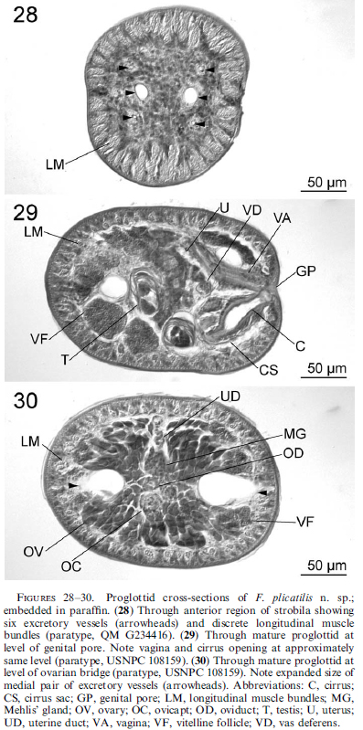 six excretory vessels (arrowheads) and discrete longitudinal ... MoreFIGURES 2830. Proglottid cross-sections of F. plicatilis n. sp.;