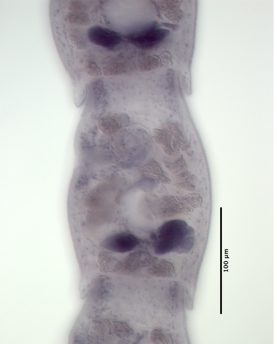 (paratype, QM G234421). (20) Mature proglottid in which testes are degenerated (holotype, QM G234414). Arrowheads indicate level at which sections in Figs. 2830 were taken. |