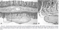 wall, showing intimate association between apical organ and host intestinal mucosa; black outline indicates region shown in B. (B) Close-up of attached