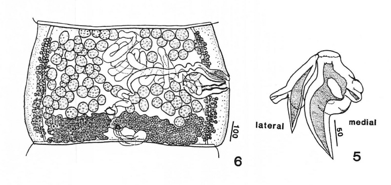 From Caira & Machida, 1986 (Cit# 91). Figs. 5-6. Onchobothrium triacis n. comb. (holotype, MPM No. SY-5062). 5. Hooks. 6. Mature proglottid.