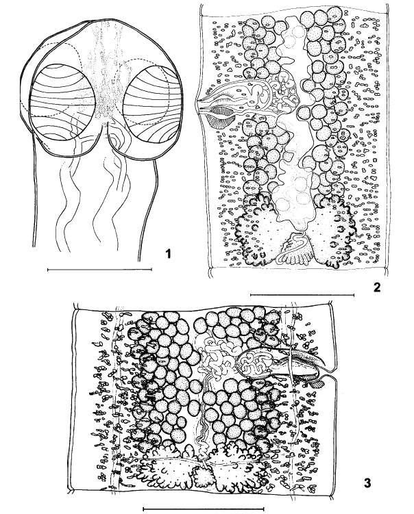 Travassiella avitellina Rego & Pavanelli, 1987. Fig. 1: scolex, showing the elongate bottle shape gland cells. Bar = 250 µm. Fig. 2: gravid proglottis, ventral view. Bar = 500 µm. Fig. 3: mature proglottis, dorsal view. Bar = 500 µm.