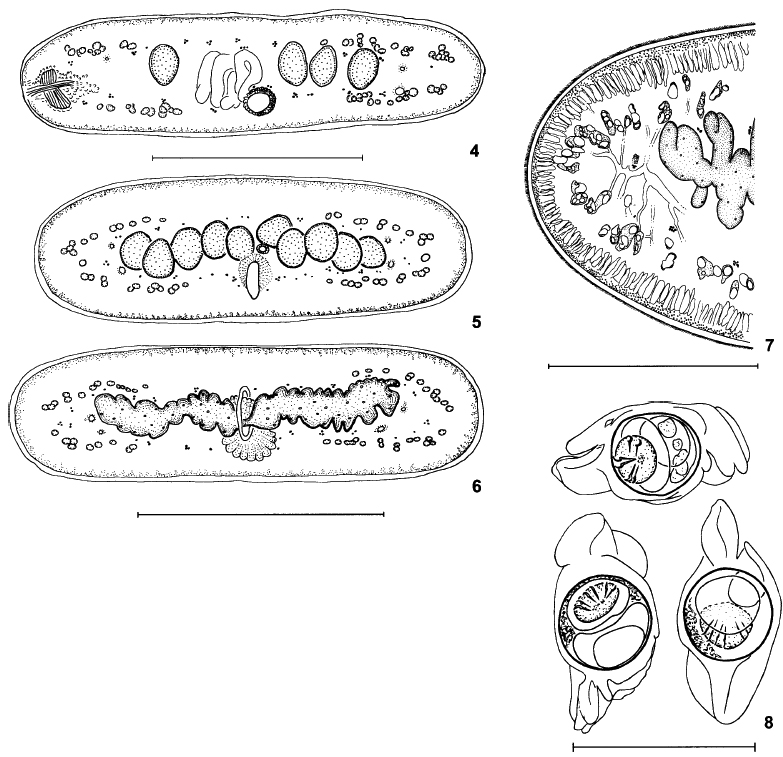Travassiella avitellina Rego & Pavanelli, 1987. Cross-sections of mature proglottides, showing internal longitudinal musculature, osmoregulatory canals and cortical vitelline follicles forming lateral arches. Fig. 4: cross-section at level of vagina, shwoing muscular sphincter and cortical uterus. Bar = 500 µm. Fig. 5: cross-section posterior to cirrus pouch and anterior to ovary, showing testes and vaginal duct, and the development of uterus into medulla. Fig. 6: cross-section at level of ovary, showing Mehlis' glands. Bar = 500 µm. Fig. 7: detail of vitelline follicles, showing the lumens and non-chromophil granular structure. Bar = 250 µm. Fig. 8: eggs drawn in distilled water, after fixation. Bar = 50 µm.