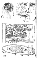 Travasiella avitellina gen.n., sp. n.: Fig. 1 - Escolex. Fig. 2 - Corte longitudinal, segmento grávido. bc = bolsa do cirro; ov = ovário; ut = útero. Fig. 3 - Segmento maturo. Fig. 4 - Corte transversal, segmento grávido. ut = útero; cd = canal deferente; vd = vaso excretory dorsal, vv = vaso central; bc = bolsa do cirro.