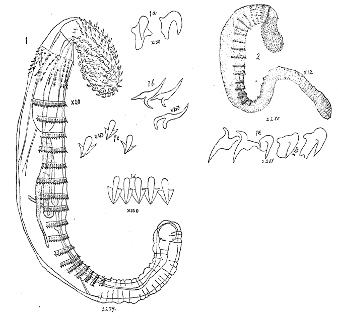 Plate VI. Fig. 1-2. Fig. 1. Echinorhychus sagittifer sp. nov. Outline sketch of young, showing protruded proboscis, neck, collar armed with sagittate spines, transverse rows of sagittate spines on the body, and, interiorly, the proboscis sheath, retractor muscles of the same, the genitalia depending from sheath of proboscis, enlarged 20 diameters. Fig. 1a. Hooks of proboscis, ventral side, enlarged about 150 diameters. Fig 1b. Hooks of proboscis, dorsal side, enlarged about 150 diameters. Fig. 1c. Sagittate spines from collar, enlarged about 150 diameters. Fig. 1d. Sagittate spines from one of the transverse ventral rows on body, enlarged about 150 diameters. Fig. 1e. Five contiguous hooks in one of the spiral series on the proboscis, enlarged about 150 diameters. Fig. 2. Sketch of live specimen, somewhat flattened by the compressor, enlarged 12 diameters.