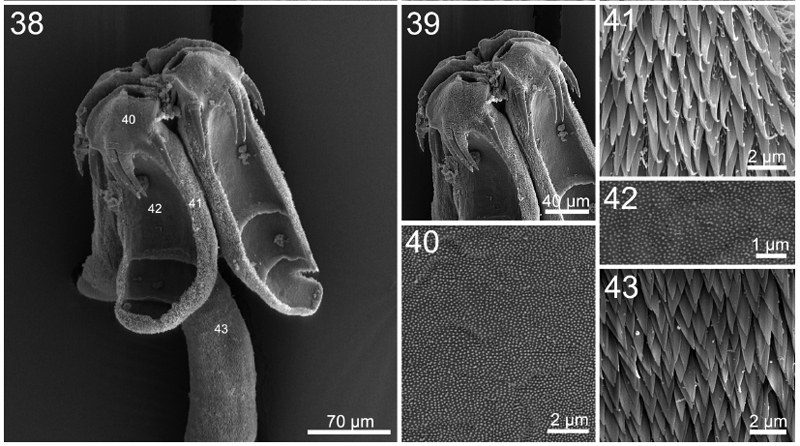 Figs. 38–43. Scanning electron micrographs of Acanthobothrium jamesi sp. n. from Rhynchobatus cf. djiddensis 2. Fig. 38. Scolex. Fig. 39. Apical pad and hooks. Fig. 40. Surface of apical pad. Fig. 41. Proximal bothridial surface. Fig. 42. Distal pothridial surface. Fig. 43. Cephalic peduncle surface.
