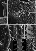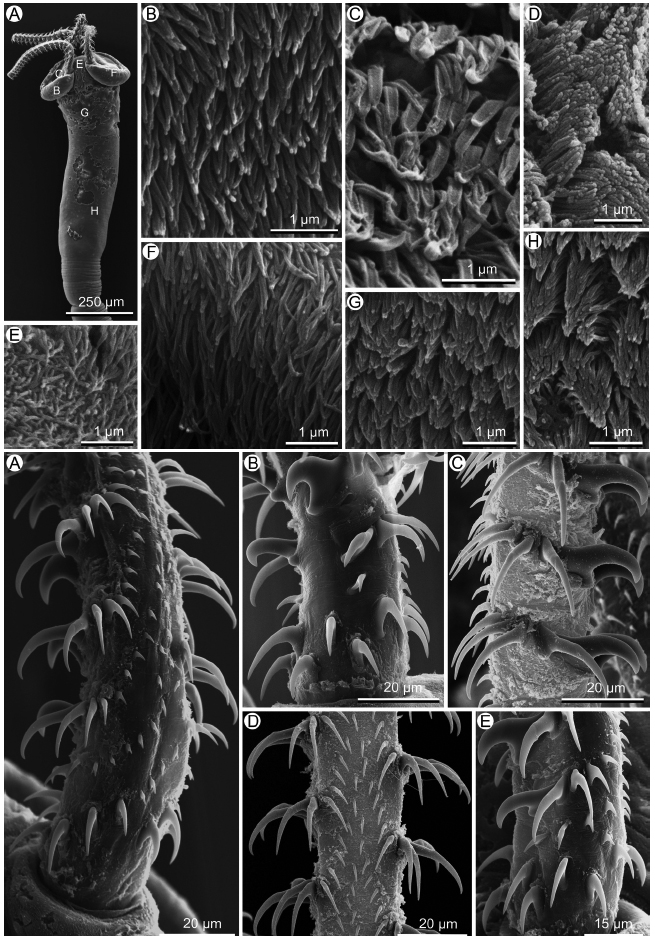 Fig. 9. (Top two rows). Scanning electron micrographs of Parachristianella damiani sp. n. from Myliobatis goodei. A - scolex, lateral view; small letters indicate locations of details shown in figures B,C,E-H. B - proximal bothrial surface (acicular filitriches); C - distal bothrial surface (aristate lingulate spinitriches and capilliform filitriches); D - surface of terminal proglottid (acicular to capilliform filitriches); E - apex of scolex (acicular filitriches); F - bothrial margin (capilliform filitriches); G - surface of pars vaginalis (acicular filitriches); H - surface of parts bulbosa (acicular filitriches).