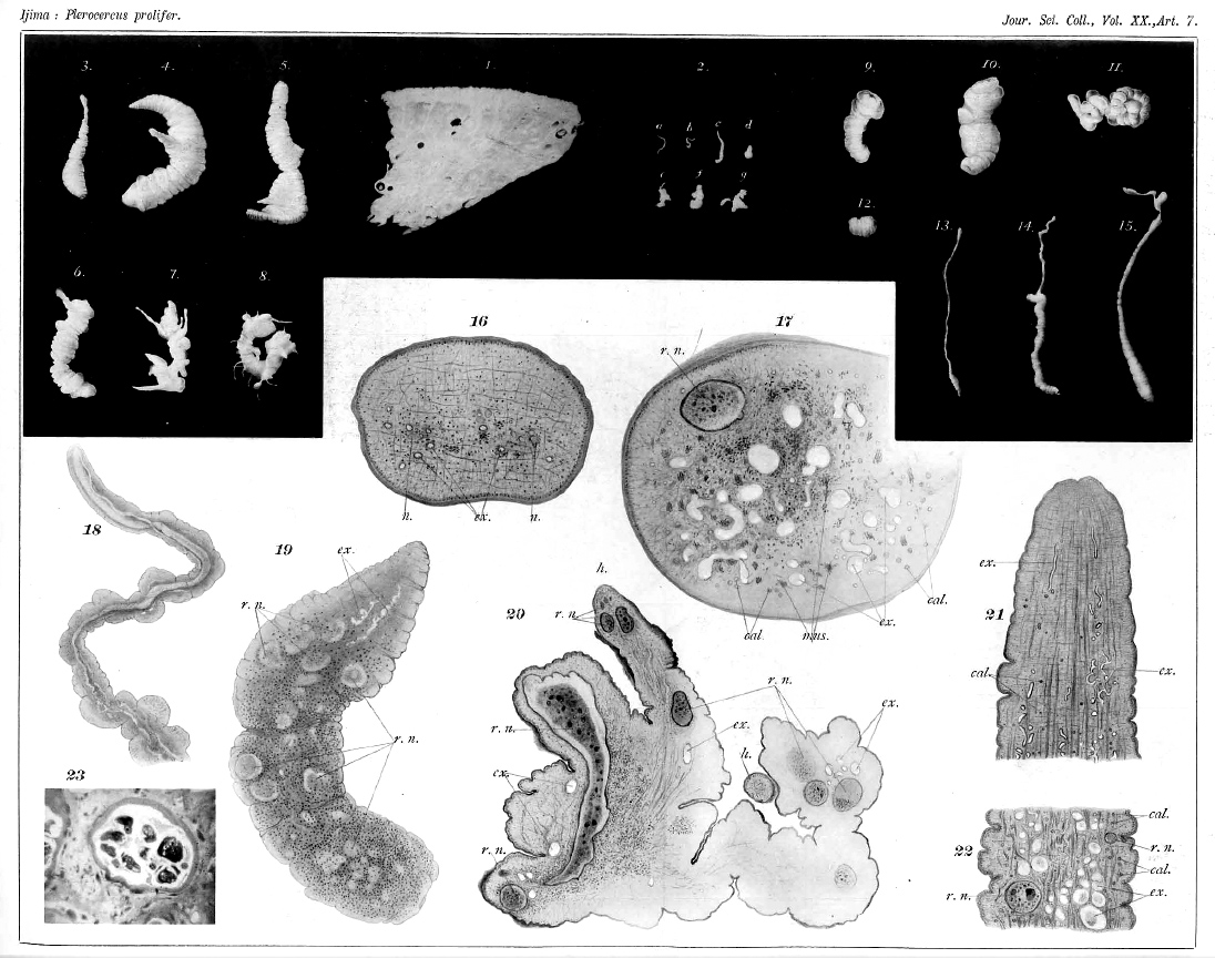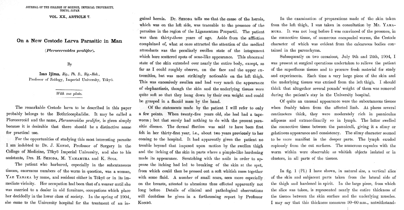 Ijima, I. 1905. On a new cestode larva parasitic in man (Plerocercoides prolifer). Journal of the College of Science Imperial University, Tokyo, Japan 20: 1–21. (7099) Download PDF |